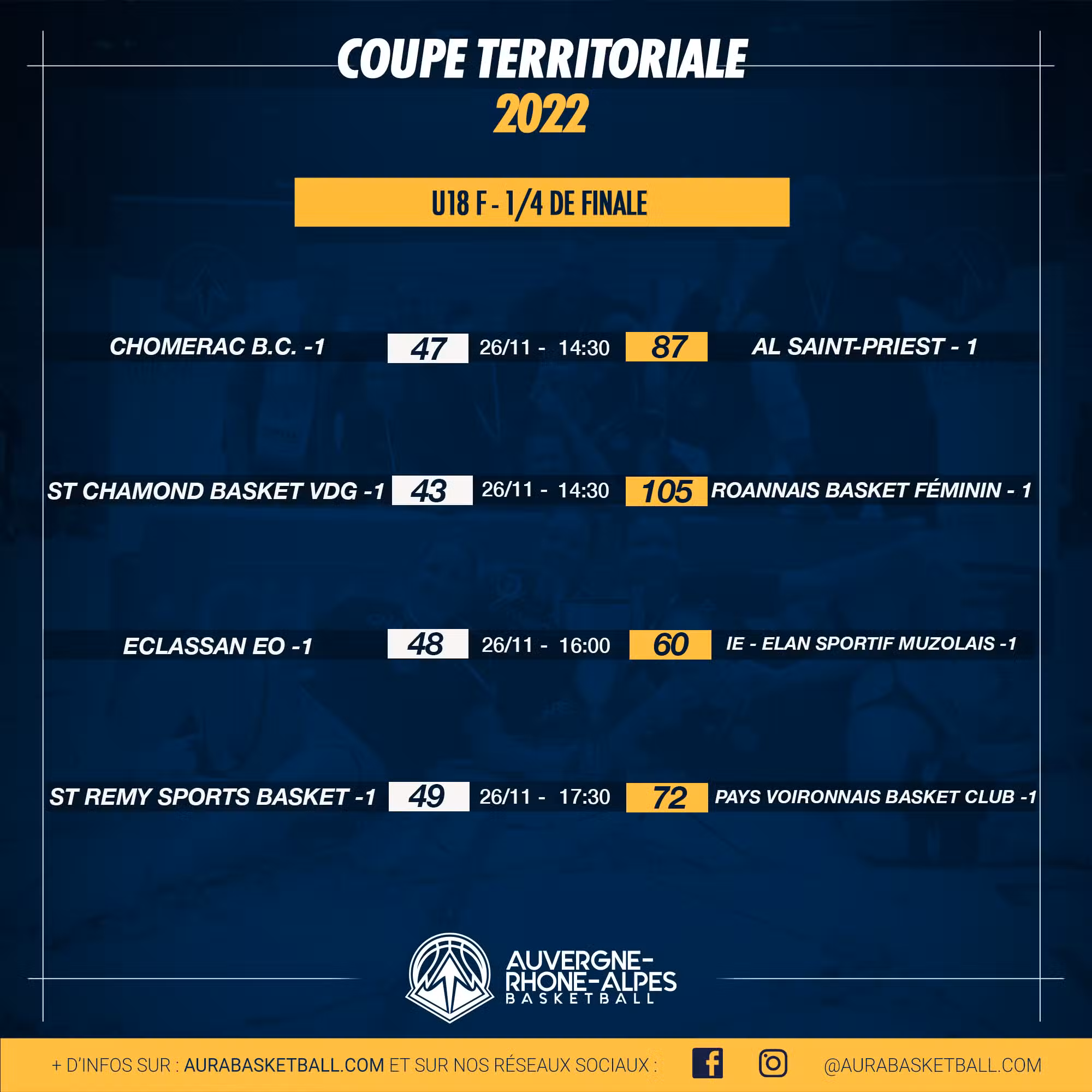 - Concernant les catégories jeunes, et à la suite de ce week-end, les deux équipes victorieuses en U18F, et les 4 équipes victorieuses en U17M sont qualifiées pour les phases finales de la Coupe de France. Les U17M joueront les demi-finales le 17 décembre à Voiron !