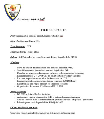 Le club d'Ambérieu en Bugey (01) recherche son responsable de l'école de basket, entrainements U7 U9 U11 + administratif + possibilité d'une équipe région. BP JEPS au minimum. CDI 35h
